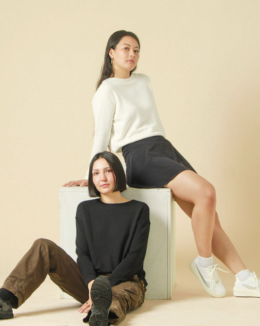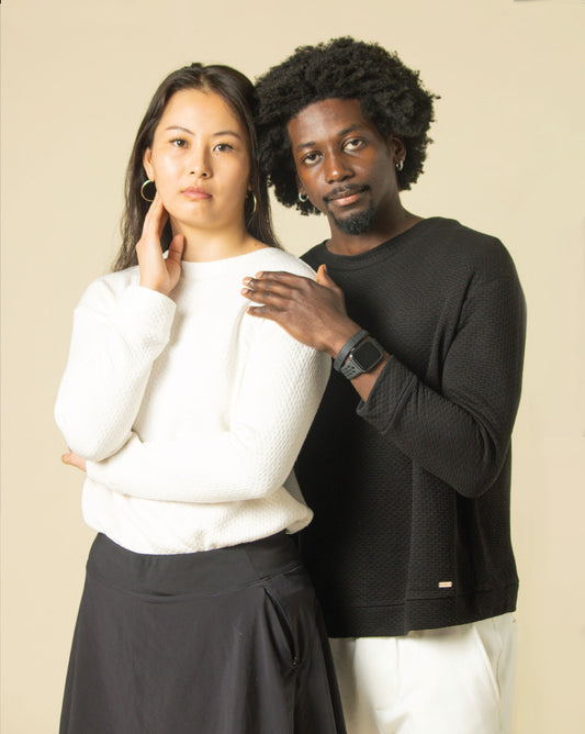 Traditionally, wool and cashmere have been among the warmest fabrics on the market. This is largely due to the structure of the individual fibers, which each have a hydrophobic, moisture-wicking exterior and an absorbent, hydrophilic core. This allows the evaporated moisture being produced from the body to be wicked away and held in the core as insulation without any feeling of wetness against the skin. Our sweaters work the same way except that we use fabric made from bamboo cellulose, which has remarkably similar thermal properties without the use of livestock. The multi-dimensional, heat-trapping knit structure is just the icing on the vegan cake.